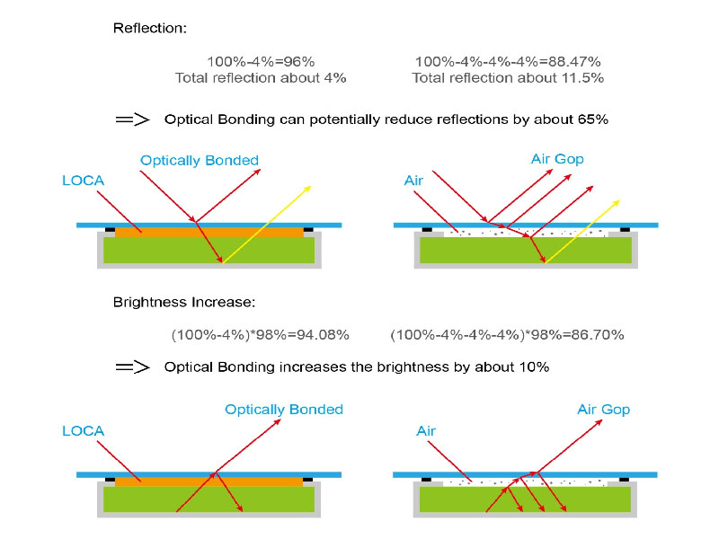 By bonding the LCD module and glass together it removes the interruptions and chances for the light to be reflected back. More light gets through to the surface of the screen and therefore the image is brighter.