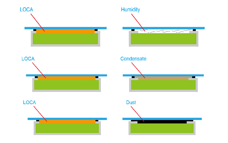 The most obvious benefit to adding a resin bonding layer between the glass and LCD module is that it physically prevents dust and liquid ingress from getting between the two.